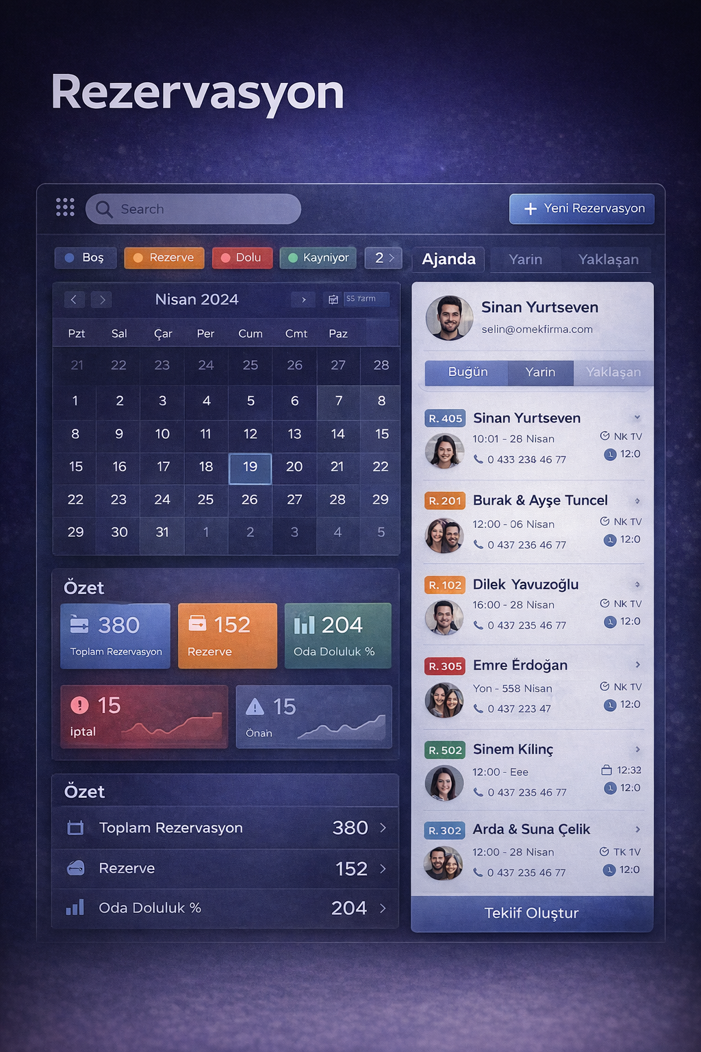 Pingu; müşteri kayıtları, teklif süreçleri, projeler, rezervasyonlar ve operasyon verilerini ayrı modüller gibi değil, tek veri mimarisi içinde yönetir.