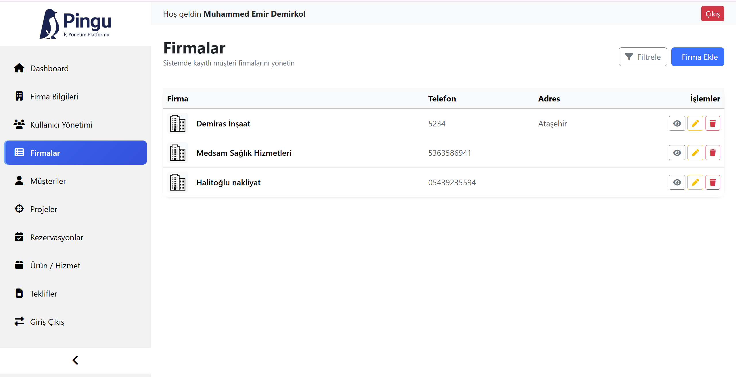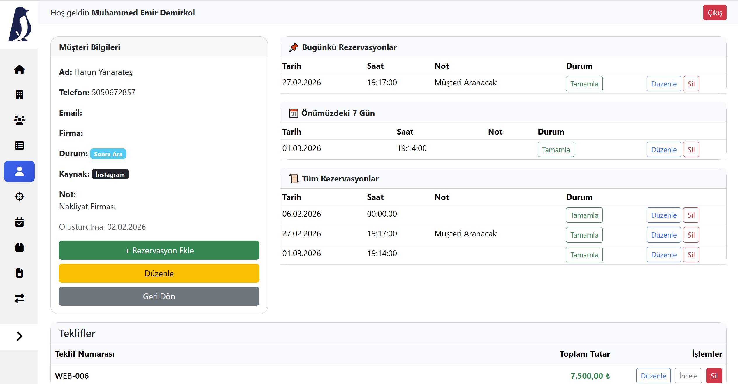 Firma oluşturun, yetkili kişileri yönetin, müşteri durumlarını takip edin ve tüm iletişim geçmişini tek panelden izleyin. Dağınık müşteri listeleri yerine, filtrelenebilir ve yönetilebilir bir CRM altyapısı kurun.