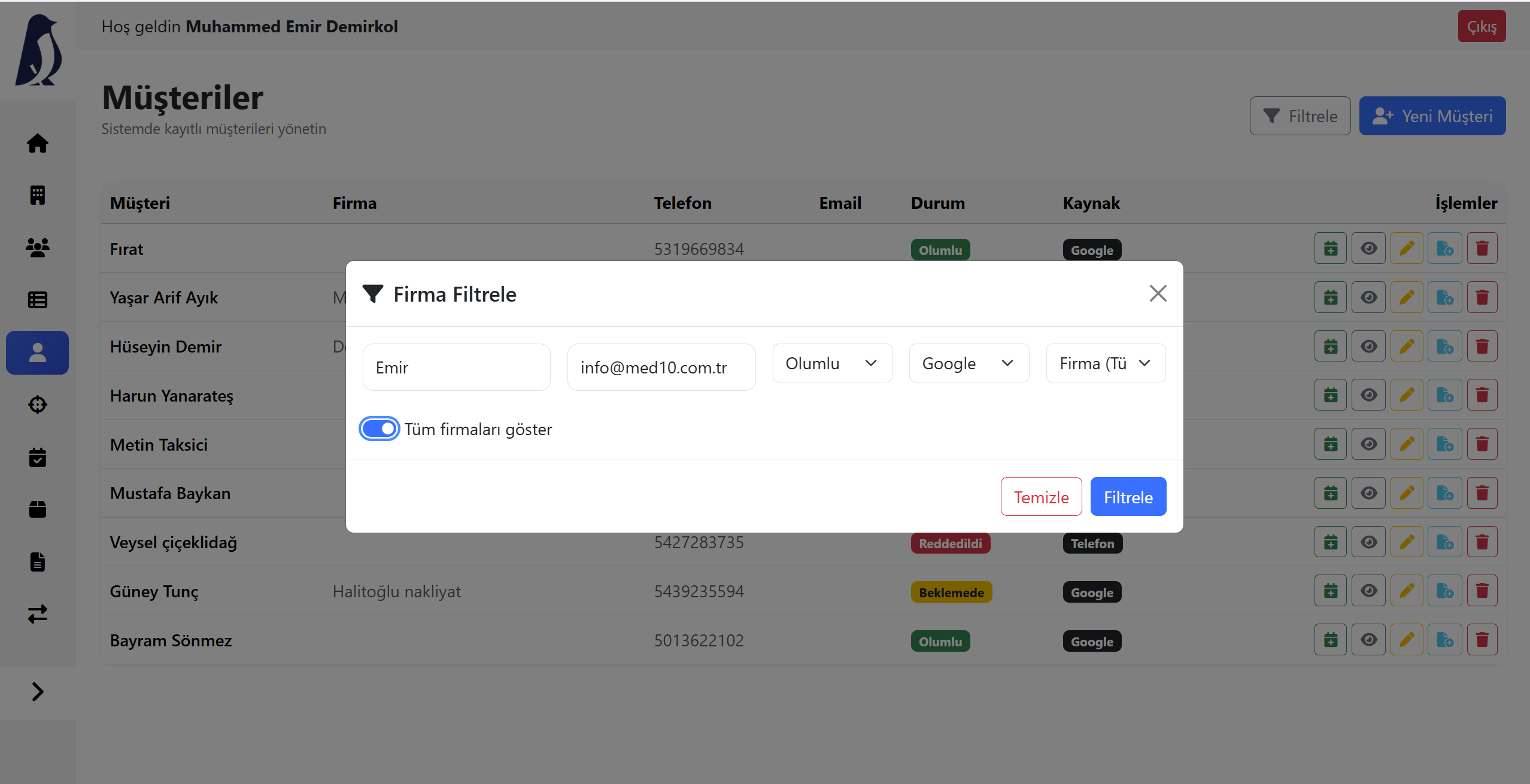 Müşterilerinizi durumuna, kaynağına, firma adına veya özel etiketlere göre filtreleyin. Aradığınız veriye anında ulaşın.
