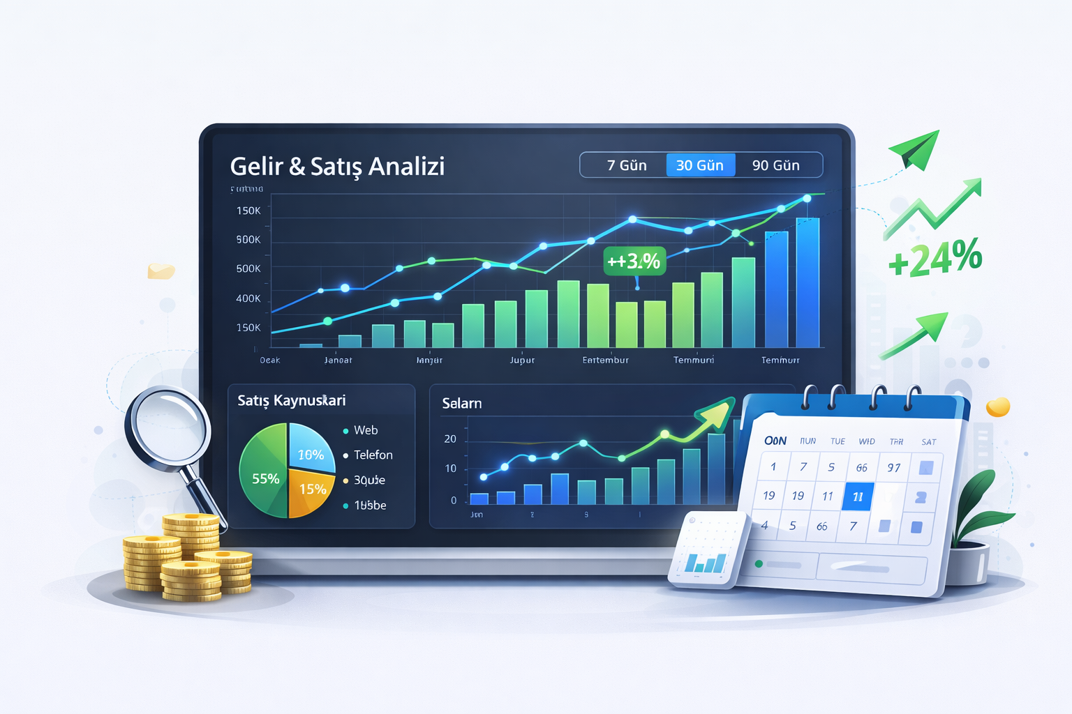 Günlük, haftalık ve aylık bazda gelir trendini, teklif → satış dönüşüm oranlarını ve tahsilat performansını grafikler üzerinden izleyin. Manuel rapor hazırlama sürecini ortadan kaldırın.