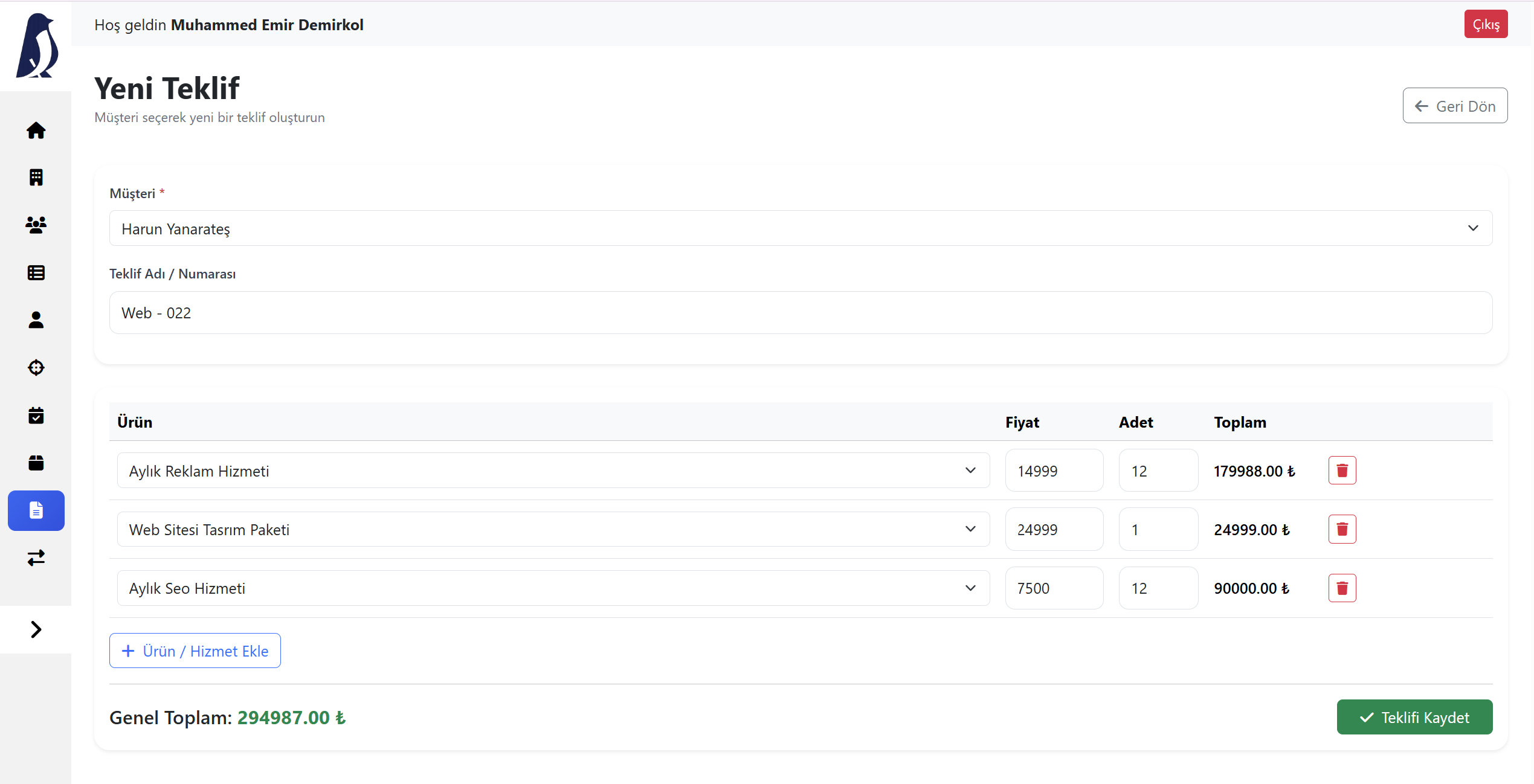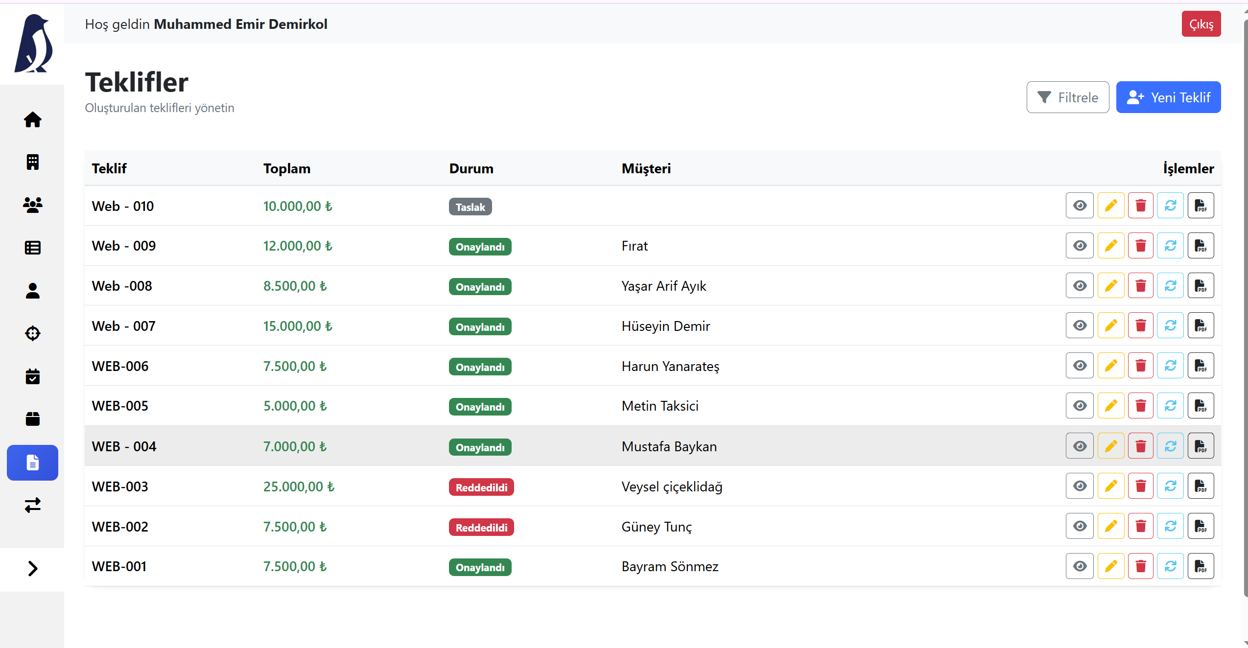 Teklif oluşturun, PDF gönderin, müşteri onayını takip edin ve satış sürecini tek panelden yönetin. Excel karmaşasına son verin.